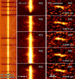 Figure 1: High-resolution near-infrared spectroscopy of carbon monoxide emission lines from HD 141569A Left: The spectrum of HD 141569A after sky subtraction. The CO emission lines extend out to 50AU on both sides of the star. Middle: A close up of the emission lines showing a blue-shift in the north and a red-shift in the south. Right: Same as the middle panel, but with stellar continuum emission subtracted. This spectrum shows the rotation of the gas in the young star HD 141569A's disk. The gap between the northern and southern parts of the disk, seen in the panels on the right, is the inner cavity. Gas is moving away from the us in the north, and towards us in the south. (Enlarge) |