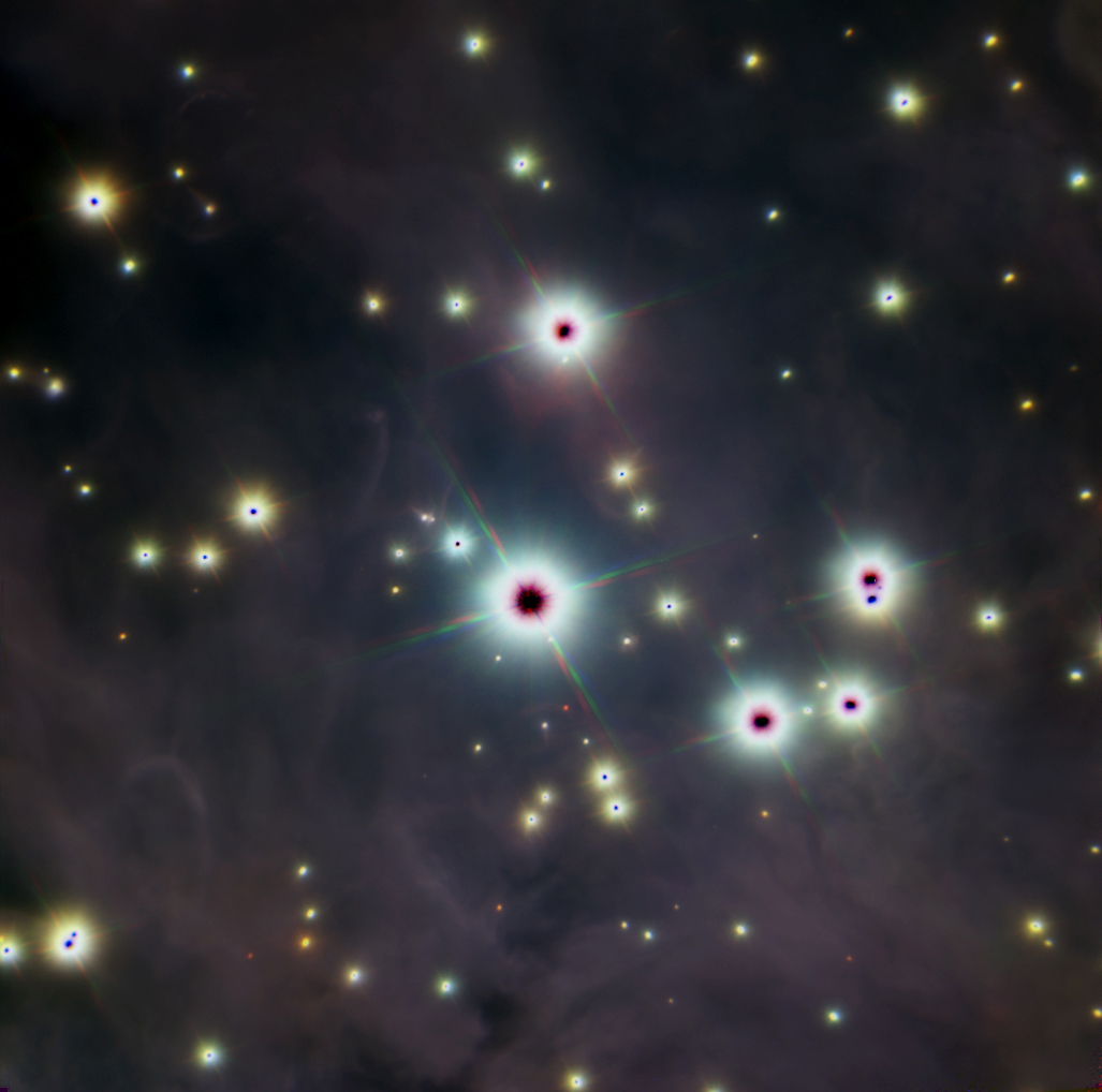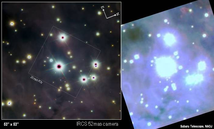 On October 9, 2006 the Subaru telescope researchers used a new adaptive optics system to obtain an image of the Trapezium region of the Orion Nebula. A comparison of this new image with a first light image taken when the Subaru telescope first began observing in 1999 (Figure 1), shows a dramatic increase in contrast and detail in the higher-resolution image. With the new system in place, including a newly installed laser guide star system, to measure and correct for the effect of turbulence in real-time, Subaru's eyesight has been improved by a factor of ten, giving astronomers a clearer view of the universe.