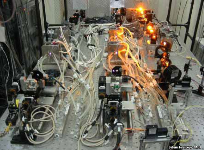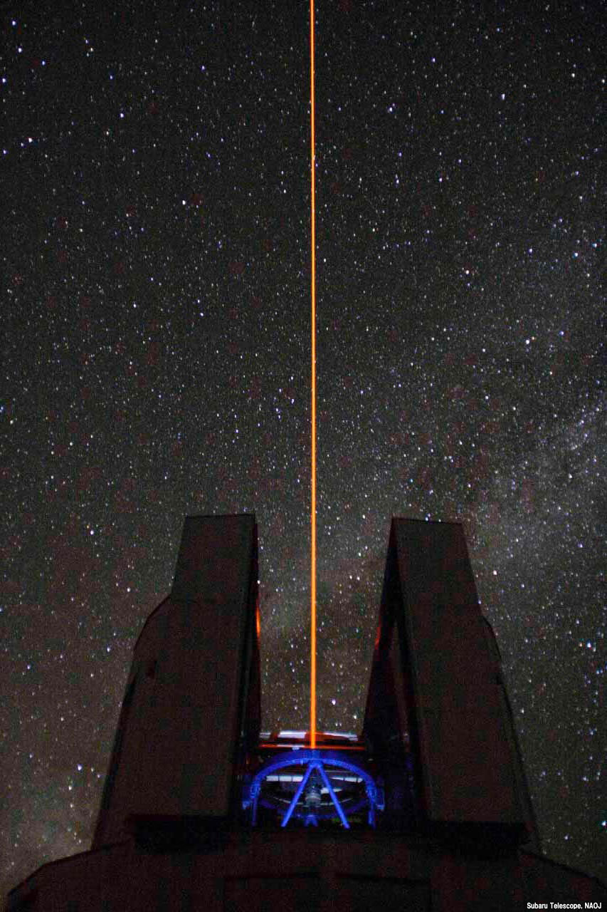 Subaru's adaptive optics development team has been working on upgrading its older 36-element adaptive optics system with an improved 188-element system for the past five years. At the same time, the team also developed and installed a new laser guide star system that allows astronomers to create an artificial star anywhere in the sky. They use light from the artificial star to measure the twinkle brought on by the atmosphere. That information is then used by the adaptive optics system to deform a special mirror that removes the twinkle and clarifies the view.