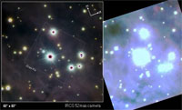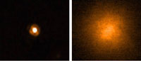 Figure 1: An image of the trapezium region in the Orion Nebula with and without adaptive optics. The image on the right has a resolution of 0.6 arcseconds and was obtained with Subaru's CISCO camera in 1999 without the use of adaptive optics. The image on the left has a resolution of 0.06 arcseconds and was obtained in October 2006 using Subaru's IRCS camera and the new adaptive optics system. (Enlarge) |