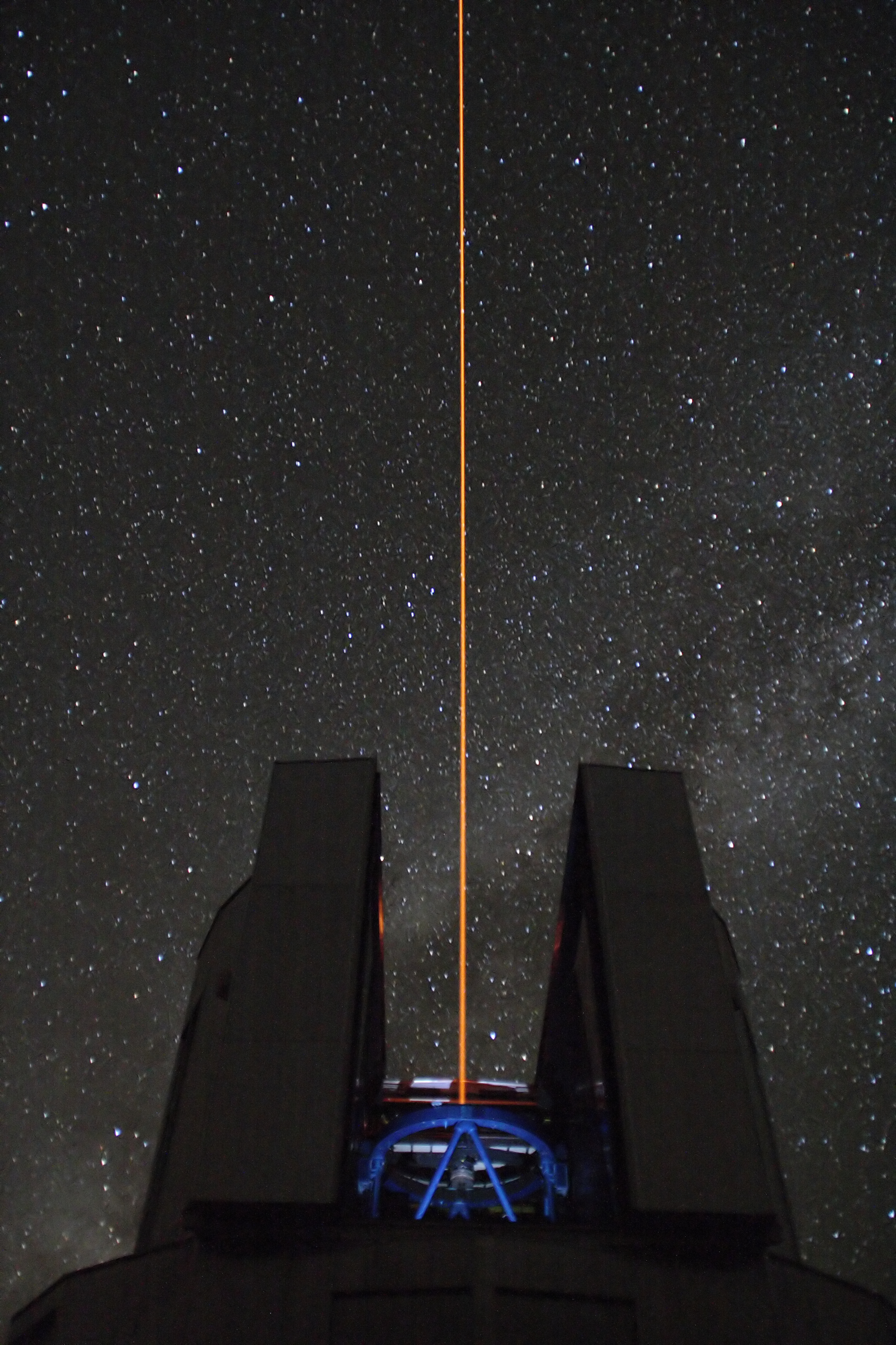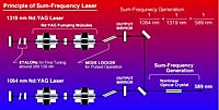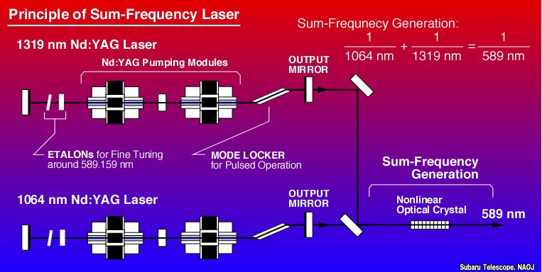 Note 7: The 589-nanometer laser is a sum-frequency laser created by mixing a 1319 nanometer Nd: YAG laser and 1064 nanometer Nd:YAG laser in a non-linear crystal. This laser was developed by RIKEN's Solid State Optical Device Research Unit, led by Dr. Satoshi Wada, and engineers at MegaOpto Co. Ltd, led by Kazuyuki Akagawa and others. By designing and fabricating a laser resonator with great precision and using the latest laser control technology and components such as non-linear optical crystals, the researchers were able to create a laser whose performance approaches the theoretical limit. The laser is tuned to the sodium D2 line with a six to seven digit precision (about 0.1 picometers), has a high output (4.7 watts) and is stable (less than 2% variability). See http://www.naoj.org/Pressrelease/2005/07/06/index.html for information from a July 2005 RIKEN press release on the first tests of the laser in Japan.