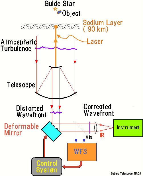 Figure 3: A schematic diagram of how the adaptive optics and laser guide star systems work. The adaptive optics system measures the distortion in the light from a guide star and then sends the light from the observing target to a deformable mirror whose surface shape is adjusted so that the distortions are removed from it upon reflection. (Enlarge) |