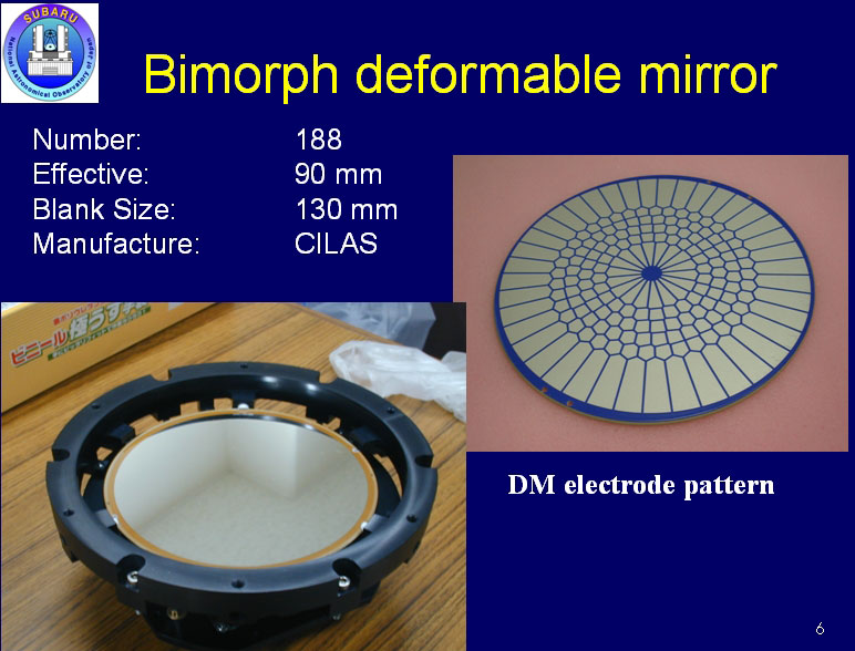 Note 5: Wavefront errors are corrected using a bimorph-type piezo-electric deformable mirror 130-millimeters in diameter and only 2.0 millimeters thick. The 188 voltage-controlled segments move at high speed to change the deformable mirror's surface shape. (Piezo-electric material is a special ceramic that expands and contracts in response to a voltage applied to it.) The actuators applying the voltage to the deformable mirror have the same arrangement as the micro-lenses in the lenslet array.