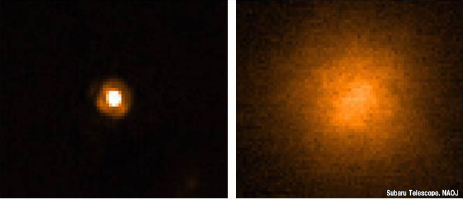 In practice, even with the excellent observing conditions on Mauna Kea, the typical resolution Subaru can obtain is 0.6 arcseconds because of the atmospheric turbulence that causes light traveling from stars and other objects to twinkle and blur. Fortunately, adaptive optics technology removes the twinkle and eliminates the blur. This allows astronomers to see greater detail in the objects they observe.
