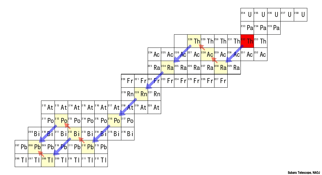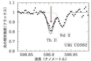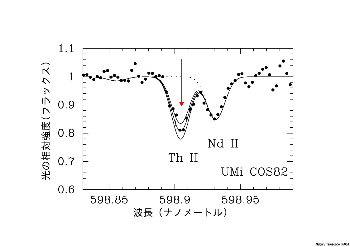 注2: この星の鉄やカルシウムなどの主な金属元素は太陽の約30分の一程度しかないにもかかわらず、 鉄より重い元素の組成は太陽と同程度であることが知られていました。鉄より重い元素のなかでは、バリウム(Ba)やユーロピウム(Eu)などが測定可能です。それらの組成比から、この星の重元素は星のなかでのゆっくりした反応によるものではなく、爆発的な元素合成の結果であると推測されていました。今回のトリウムの検出により、それが決定的になりました。