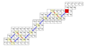 注1: 鉄より重い元素は、原子核 (陽子と中性子から成る) が、中性子を次々と捕獲して成長することによりつくられます。この反応が星の中で何年もかけてゆっくり起こる場合には、鉛やビスマスで反応は終わりになります。中性子を捕獲する反応がごく短時間 (1秒以下) で起こる場合には、不安定な原子核を経由する反応も可能となり、反応終了後も寿命の長い原子核(232Thや238Uなど)は長期にわたって生き残ります(図1)。超新星爆発における重元素合成のモデルによれば、アクチノイドの合成量は爆発時のエントロピーや、陽子・電子・中性子の存在割合などによって一桁以上変わってくると予想されています。