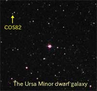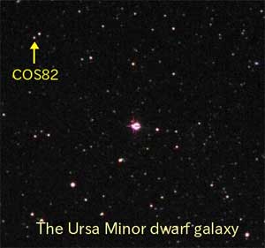 図2:こぐま座矮小銀河。画像はDSS(宇宙望遠鏡科学研究所)によるもので、元データはパロマー天文台サーベイ (カリフォルニア工科大学) より。視野は14分角x14分角。矮小銀河の星の密度は低く、この銀河までの距離は比較的近い (約22万光年)ため、一見しても銀河の形ははっきりしない。