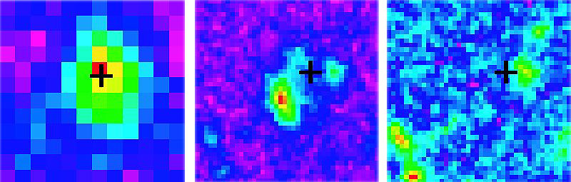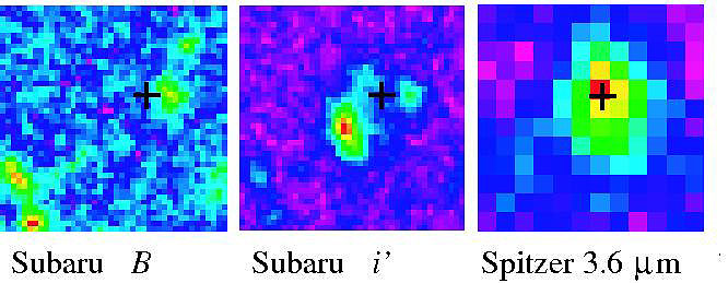図3: 図1の三つの画像をそれぞれの波長ごとに分けたもの。左から、すばる望遠鏡による可視光・短波長 (青色) の画像 (B バンド、波長約 0.45 ミクロン)、同じくすばる望遠鏡による可視光・長波長 (赤色) の画像 (i'バンド、波長約 0.76 ミクロン)、スピッツァー宇宙望遠鏡による赤外線の画像 (波長約 3.6 ミクロン)。 |