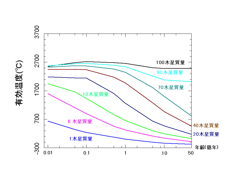 図2: 低質量星の年齢と有効温度の理論的予想図。太陽質量の 0.075 倍以上の天体は、自ら水素燃焼を起こして、星の温度が一定となります。しかし、軽い天体は自ら光らず、時間と共に冷えて暗い天体「褐色矮星」となってしまいます。(クレジット:国立天文台) |