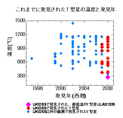 図5: 「宇宙で最も冷たい星」の変遷。過去の T型星と UKIDSS で発見されたT型星を年代別に示したものです。(クレジット:国立天文台) |