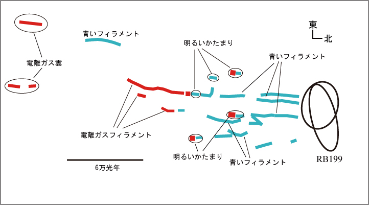 「火の玉」は、いくつかの明るいかたまり(knot)と、それに繋がる青いフィラメント、明るいかたまりに付随する電離ガス (図1で赤く見えるガス) などから構成されています (図2を参照)。明るいかたまりは、さしわたし3000~6000光年の大きさを持つ若い星の集団で、電離ガスが付随していることから、この場所で活発に星生成を行っていると考えられます (図3参照)。それぞれのかたまりは、太陽の1000万倍程度の質量を持っています。RB199と明るいかたまりを繋ぐかのように延びる青いフィラメントも、若い星からなりますが、電離ガスが見られませんので、すでに星生成は終了してしまっていると思われます。フィラメントの色を注意深く調べると、銀河から離れるに従ってより青くなっており、外側ほど星の年齢が若いことを示しています。このような特徴から、銀河RB199からはぎ取られたガスが星を作りながら銀河間空間を伝播していって「火の玉」を作ったのではないかと考えられます。「火の玉」は銀河間空間で起きている星生成の現場だということです。そのサイズや質量から考えて、明るいかたまりは将来、矮小銀河 (注2) に進化するかもしれません。