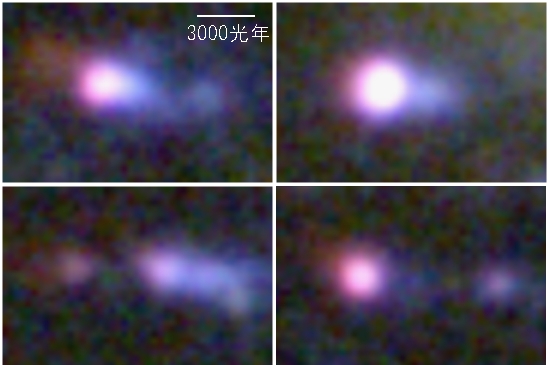 図3: 「火の玉」中の明るいかたまりの拡大図。図の方向は図1と同じで、右側に銀河RB199がある。どのかたまりもRB199から遠い側(図の左側)に赤い色で見える電離ガスが付随しているのが分かる。 |