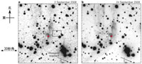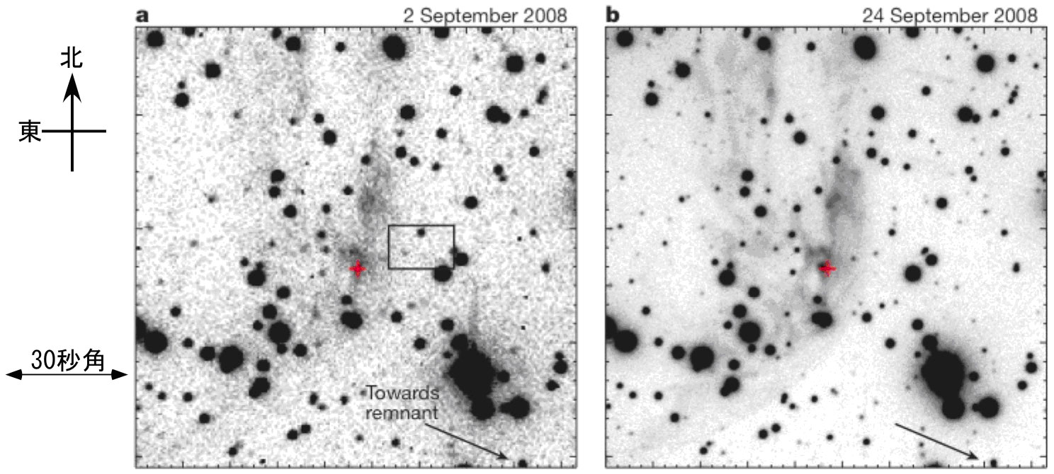 光の「こだま」の観測は、まずその候補を見つけるところから始まります。2008年の夏、研究チームは、マックスプランク研究所が持つスペインCalar Alto 2.2mおよび3.5m望遠鏡を使って、過去に光の「こだま」報告があった領域を中心にモニタリング観測を開始しました。2008年8月23日に撮像された画像には、可視光で23.6等級の淡く広がった光が移っていました。この光は、翌週の9月2日の撮像観測でも確認されました(図1a)。