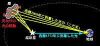 図2: 超新星ティコからの光の模式図。超新星爆発で放射された光が、西暦1572年に地球に到着しました(水色の矢印)。超新星の周囲にある塵によって反射された光が現在地球に到着しました(黄色の矢印)。2008年の8月23日から9月24日にかけて、淡い光の位置が見かけ上移動していることから、可視光の「こだま」であることが判明しました。 |