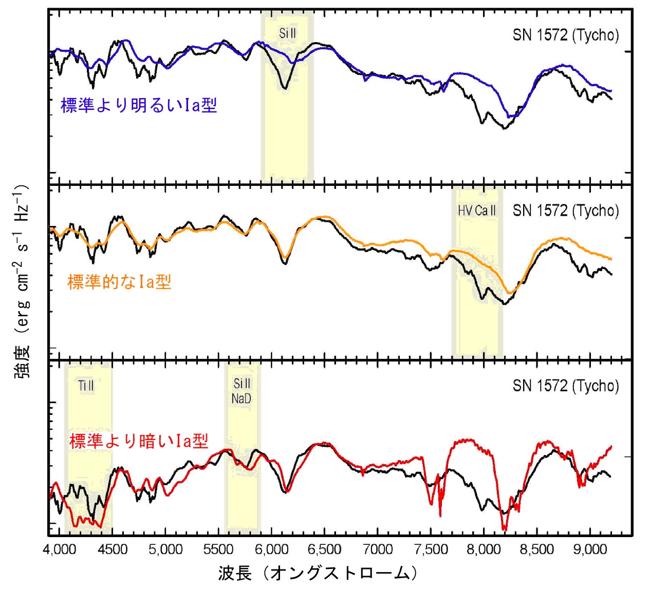 図3: すばる望遠鏡とFOCASで分光観測された、可視光の「こだま」のスペクトル(横軸は波長、縦軸は光の強さ)。黒い実線が超新星ティコのスペクトル。他の3種類のIa型超新星のスペクトル(上段から、明るいもの[青]、標準的なもの[橙]、暗いもの[赤]) と比較すると、中段のスペクトルが最も良く一致していることから、ティコは標準的なIa型超新星であったことが判明しました。 |