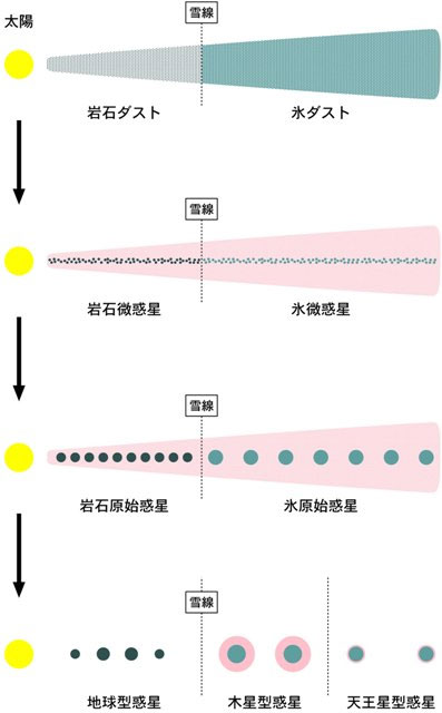 図1: 惑星系形成の概略図 (理科年表オフィシャルサイトより) 。ガスとチリ (ダスト) 原始惑星系円盤を横から見た片側のみを示している。最初は微小なチリが集積し、最終的に惑星に至ると考えられている。 |