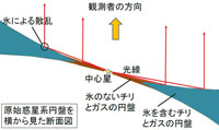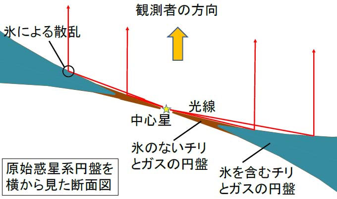 さて、太陽系を作った円盤がそうであったように、今まさに惑星が生まれつつある原始惑星系円盤にも、氷を含むチリがたくさん存在するはずです。実際、これまでの観測では、円盤とその周辺の領域に氷が存在する兆候が見つかっていました (注2)。しかし、氷が円盤のどこにあるのかは分かっていませんでした。そこで研究チームは、中心にある恒星から出た光が円盤の表面で散乱されて生じる、散乱光に刻まれた氷の兆候を調べることにしました (図2)。