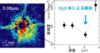 寺田らは、すばる望遠鏡を使って、2つの原始惑星系円盤を分光観測 (波長ごとの明るさを測定する観測) し、波長3.1ミクロンの氷の吸収を発見しましたが、円盤のどの部分に氷があるのかは分かりませんでした (Terada et al. 2007, ApJ, 667, 303)。