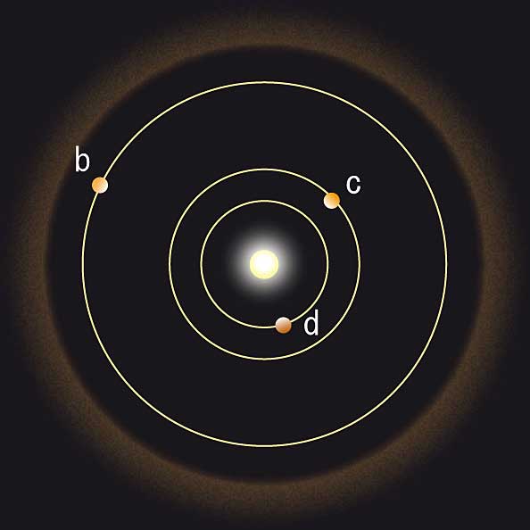 HR 8799 の惑星系は、太陽系とは大きく異なります。3 つの惑星は木星の 10 倍程度の質量を持ち、星から 24, 36, 69 AU の場所を公転していると考えられます (図2)。この惑星系がどのようなメカニズムで誕生したのか、3 つの巨大惑星がお互いの軌道を乱さずに安定して回り続けていられるのかといった点について、研究者の間で現在盛んに議論されています。また、惑星の軌道は、今回の結果からもほぼ円軌道ではないかと推測されます。しかしまだ軌道周期のごく一部しか観測されていないため、今後も惑星の位置を継続して測定していくことが重要です。
