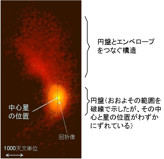 COMICS による赤外線撮影の結果、観測した全ての波長で、南北に半径 750 から 1000AU にも伸びる楕円形の放射を検出しました。南北に伸びていることから、連星の周りに連星軌道面とほぼ同じ方向に広がった円盤を、円盤面に近いところから見ていると解釈できます。また、円盤と周囲のアウトフローによる空洞がほぼ垂直です。このことは、星形成過程においては一般的に円盤の極方向に過去のアウトフロー活動が起こることとよく合致しています。今回の画像は、大質量星周円盤としては初めてとられた直接像であり、これまでに赤外線で円盤が直接撮影された天体の中で最も中心星質量が重い天体でもあります。