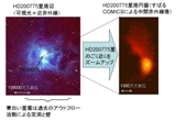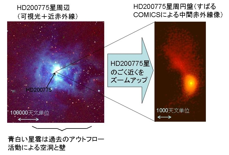 研究チームは、ケフェウス座のHD200775と呼ばれる若い星の周囲を、すばる望遠鏡の中間赤外線装置 COMICS を使って、波長 8-25 マイクロメートルの赤外線で撮影しました。 HD200775 は、地球から 1400 光年ほど離れたところにある、生まれたばかりの太陽の 10 倍ほどの質量の星です。この星が過去に行ったアウトフロー (ガスを星の極方向に吹き出す現象) 活動で作られた空洞があり、東西方向に伸びています。空洞の壁は分子ガスの密度が高くなった状態にあり、その最も星に近い部分は、 HD200775 の光に照らされて反射星雲 NGC7023 として輝いています。中心の星は実は連星で、少なくともふたつの星が軌道半径6.5AUで互いの周りを周りあっています。地球から見た連星の軌道は南北方向に伸びており、ちょうど連星軌道を公転面に近いところから見たために楕円形に伸びていることが分かっていました。