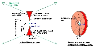 図3: HD200775 の円盤の模式図。円盤を真横から見た場合には左の図のように見え、円盤の外側にいくほど、円盤表面がめくれあがった「フレア円盤」の形状を している。中心星からの光は円盤表面に、外側の方までよくあたり、そのため円盤表面は外側までよく温まって赤外線で光っている。これを、円盤中心軸から少しずれた方向から見ると、右の図のように、円盤放射の楕円形の中心位置と、星の位置が若干だがずれる。この円盤表面からガスが蒸発し、急速に円盤が消失しつつあると考えられる。 |