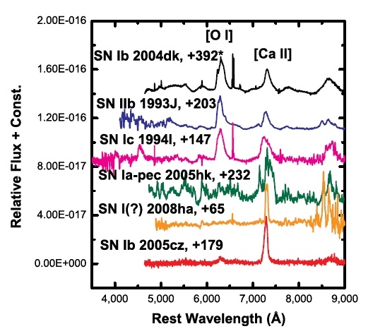 This SN was very peculiar: It was intrinsically faint, quickly faded, and showed much weaker [O I] 6300, 6364 line than [Ca II] 7291, 7323 in the late-phase spectrum (Fig. 2). The appearance in elliptical galaxy was also peculiear, since a genuine elliptical galaxy contains only old pupulation stars, that is, low-mass stars and cannot produce any core-collapse supernova.