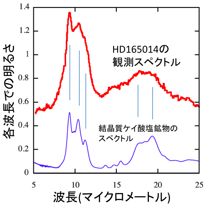 図2:スピッツァー宇宙望遠鏡による HD 165014 の赤外線スペクトル (赤)。垂線で示した位置に見られる顕著な凹凸パターンが、結晶質のケイ酸塩鉱物 (青) と一致する。 |