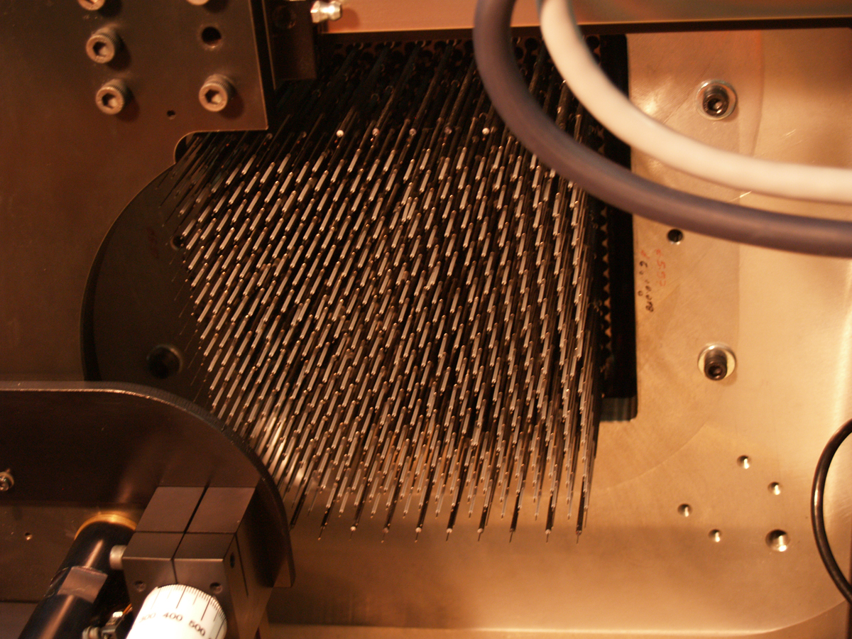 図1:すばる望遠鏡主焦点に設置されるファイバー多天体分光器 FMOS のファイバー位置制御装置 Echidna。15 センチメートル四方の中に 400 本もの光ファイバーが配置され、それぞれの位置を精密かつ独立に制御できるようになっている。