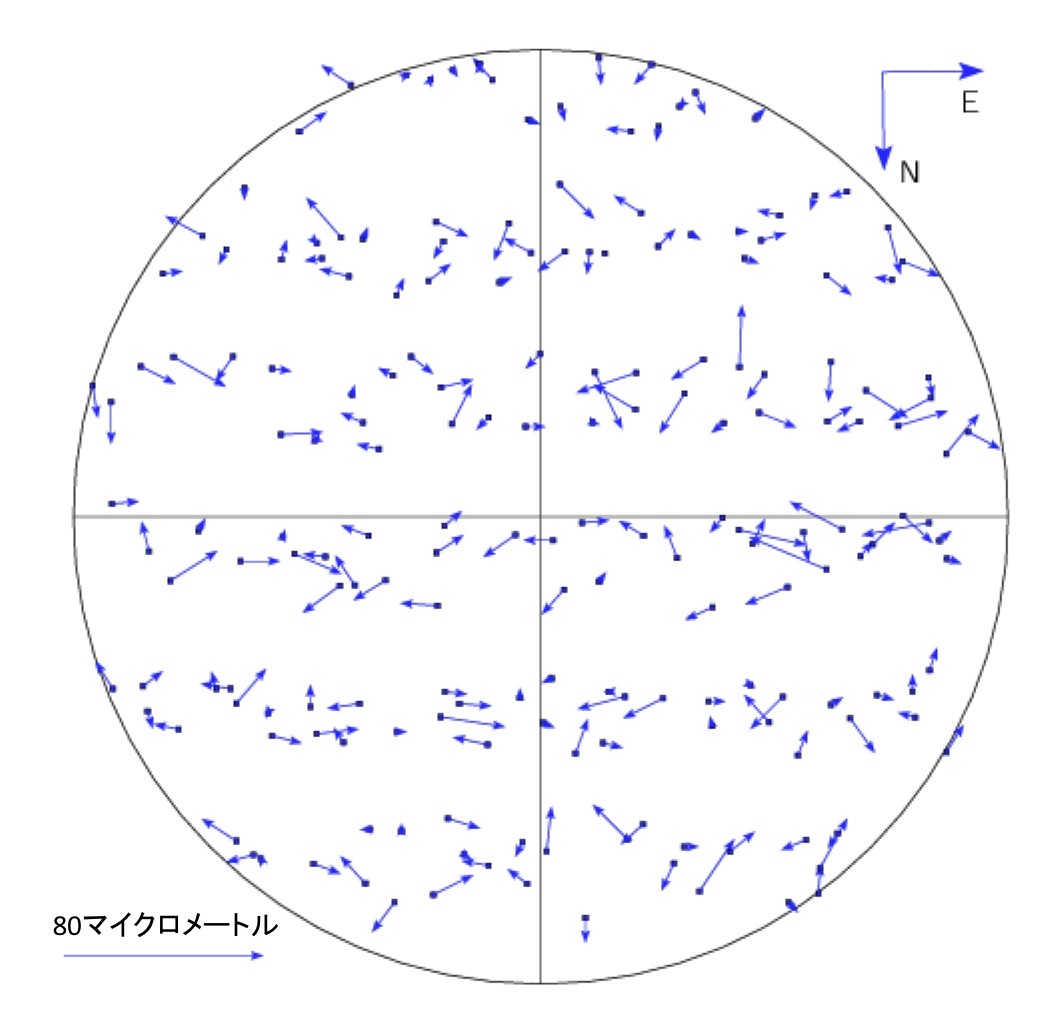 図2:試験観測時に測定された Echidna による光ファイバー位置制御の誤差の様子。大きな円は FMOS の視野を、矢印は各ファイバーの目標天体からのずれの大きさと方向を示している。それぞれ 10 マイクロメートル程の精度で配置できていることが分かる。