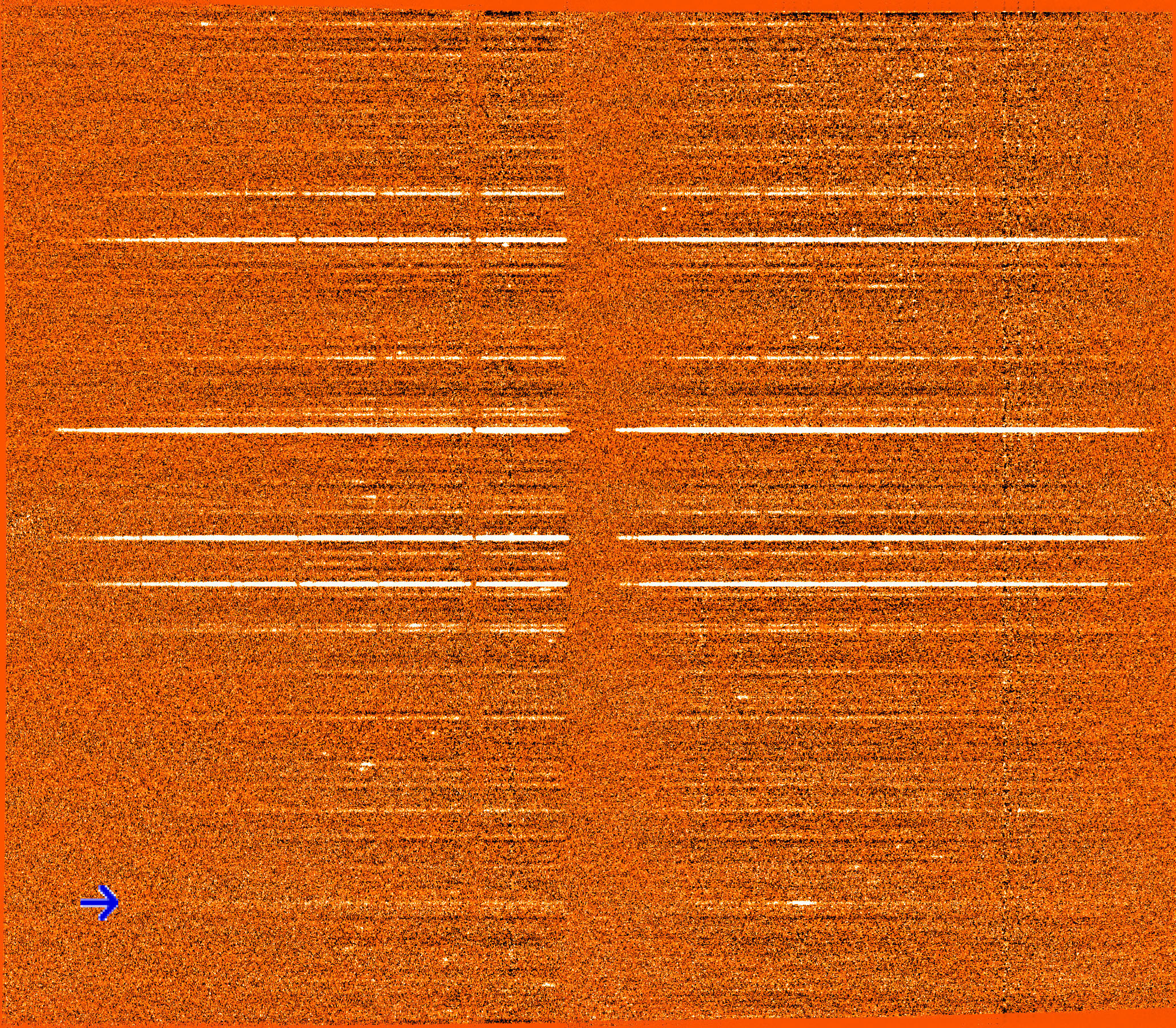 図3:試験観測時に FMOS で取得された二次元分光データ。横方向が波長分散の方向で、縦方向はファイバーが並んでいる方向。この中に 200 天体もの近赤外線スペクトル (波長に対する光の強さの分布) が写っている。青い矢印の位置に写っているスペクトルが図4に示されている。