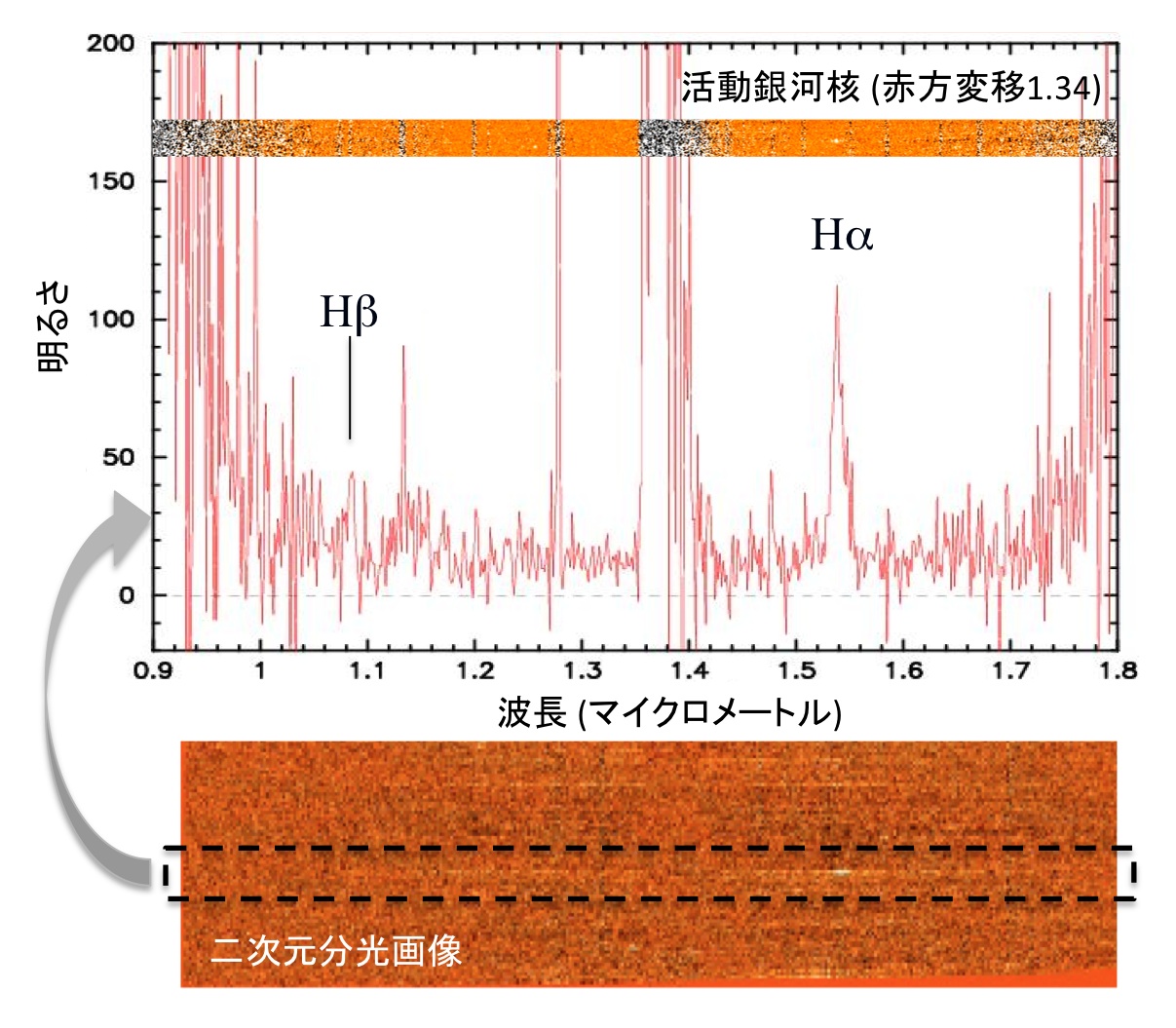 図4:試験観測時に FMOS で取得された赤方変移 1.34 の活動銀河核の近赤外線スペクトル。図3の二次元分光データ画像で矢印の位置に写っているスペクトルを示したもので、水素原子に由来するHα輝線とHβ輝線が検出されている。