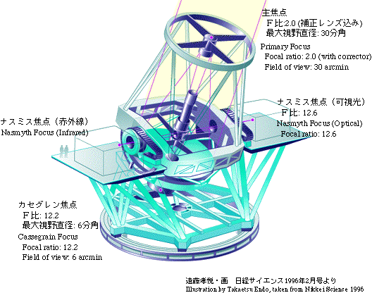 すばる望遠鏡は、主焦点、カセグレン焦点、ナスミス焦点(可視、赤外)の合計4つの焦点を備えています。COMICS は、それらの焦点のうち、主鏡の裏側に位置するカセグレン焦点に取りつける装置です。