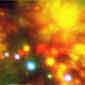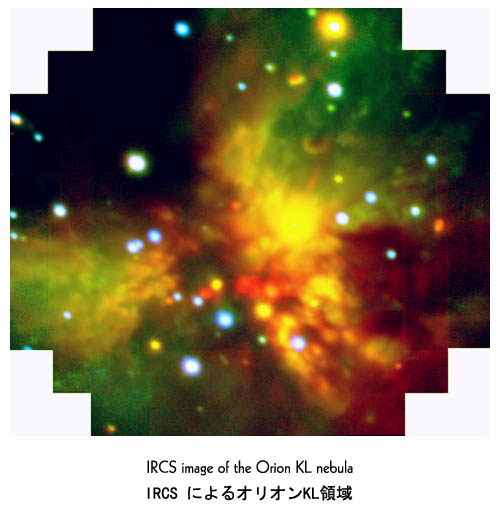 IRCS によるオリオンKL領域の画像。J, K, L' バンドの3つの画像を合成。赤い色をした天体はチリに覆われており、内部は長い波長でのみ見通すことができます。