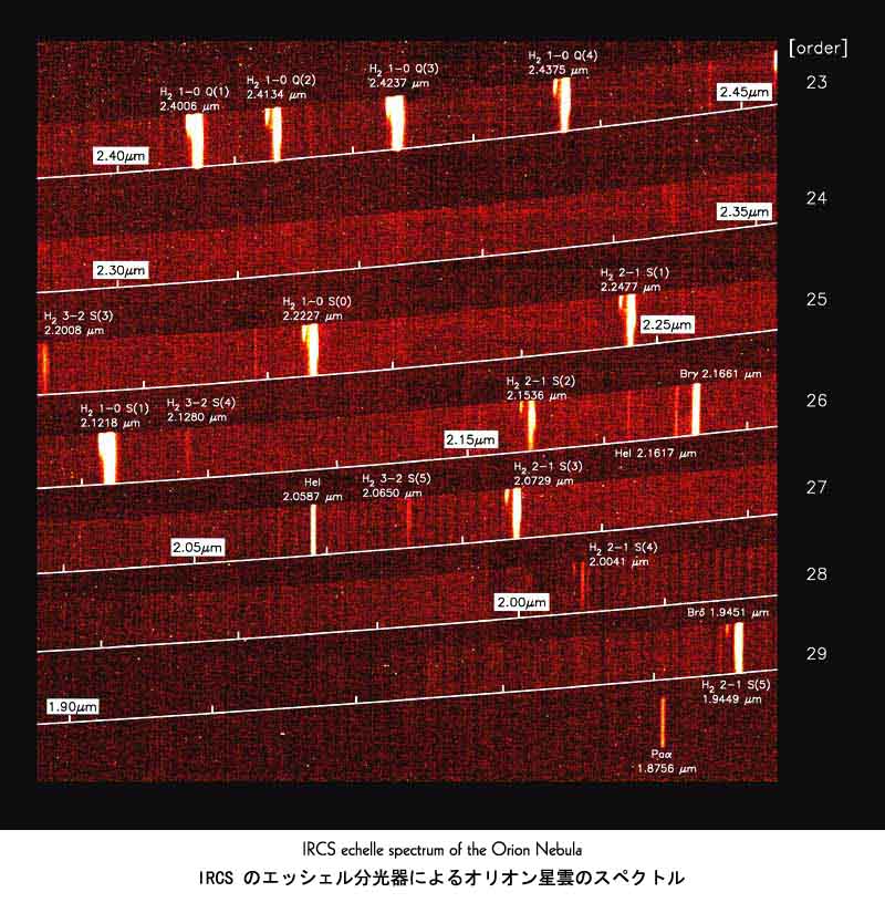 IRCS のエッシェル分光器によって得られたオリオン星雲のスペクトル。輝線は、若い星によって温められた周りのガスから出ています。いくつかの輝線は、複数の速度情報に分解されています。