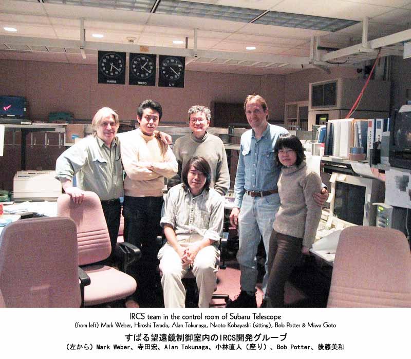 すばる望遠鏡の制御室内の IRCS 開発グループのメンバー。後列左から、 Mark Weber、寺田宏、 Alan Tokunaga、Bob Potter、後藤美和、前列に小林尚人の諸氏