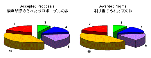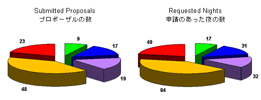 | 分野別のプロポーザルの数と申請のあった夜の数 (色は上記分野のリストに対応) |