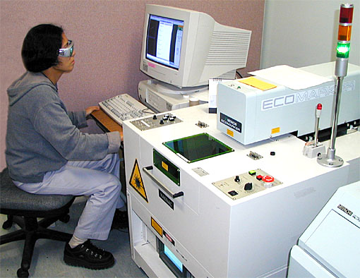 レーザー加工装置 (中央が装置の本体、左右はコントロール装置)