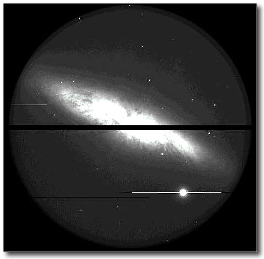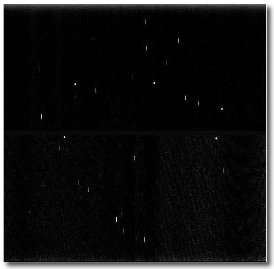 実際に MOS を用いた観測の例を見てみましょう。下の写真は、FOCAS の撮像観測による天体の画像です。中央の黒い線は、2 枚の CCD の境目に当たります。この画像に写っている天体の中から、分光観測を行う天体を選びます。