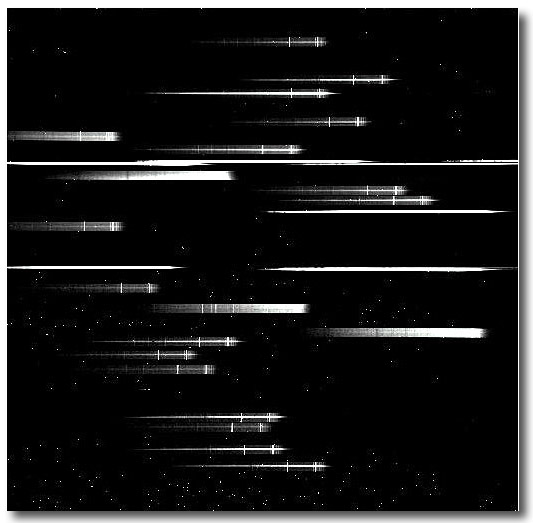 スリットを空けたシートを FOCAS に取りつけ、分光観測した結果、得られたスペクトルが下の写真です。細い帯が、それぞれの天体のスペクトルに対応します。これらのスペクトルを調べることにより、天体を構成する原子や分子を特定したり、天体の温度や遠ざかる速度を見積もることができるのです。