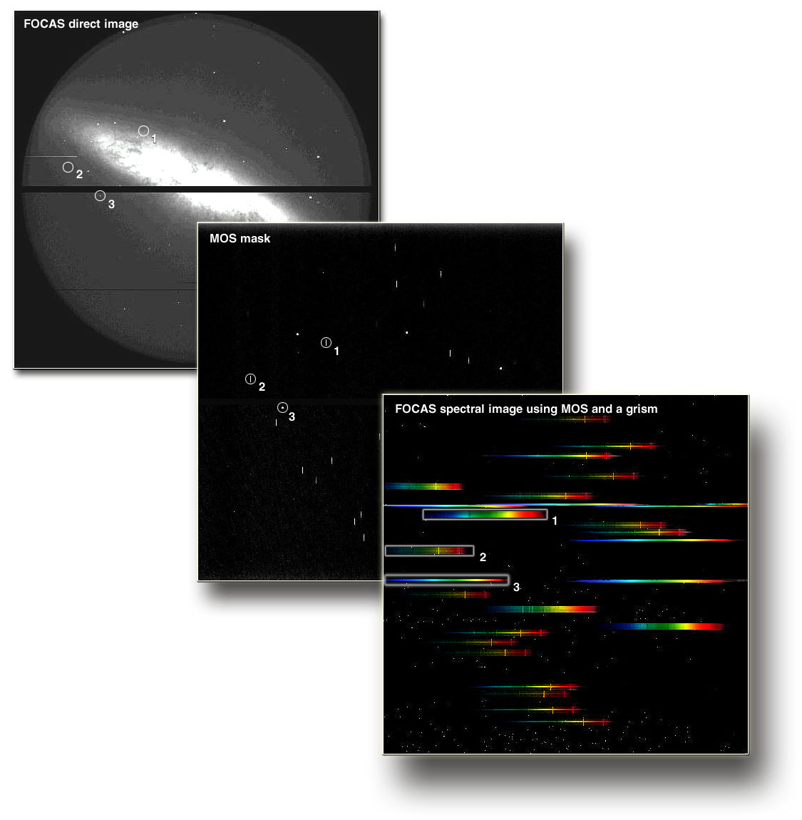 FOCAS ように、一度に数多くの天体の分光観測を行うことができる装置は、世界中の大型望遠鏡においても、今後主流になると予想されています。MOS を用いた FOCAS の分光観測は、10月から再開する共同利用観測において行われる予定です。