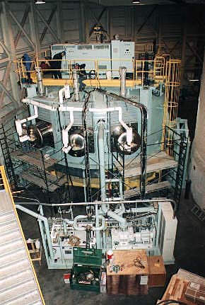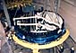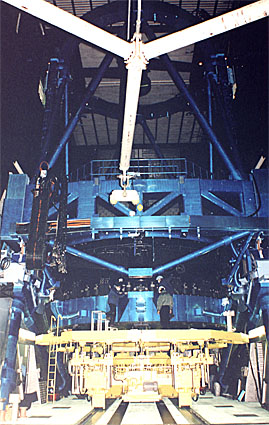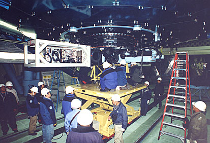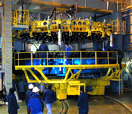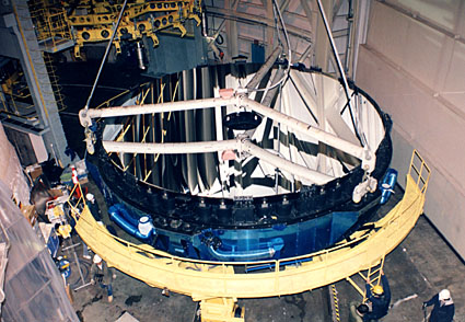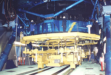 黄色い主鏡ハンドリング装置により、主鏡を主鏡セルからはずします。主鏡の重さは、約 23 トンです。