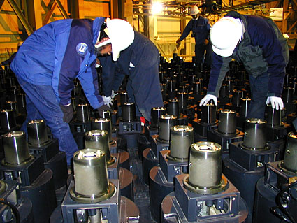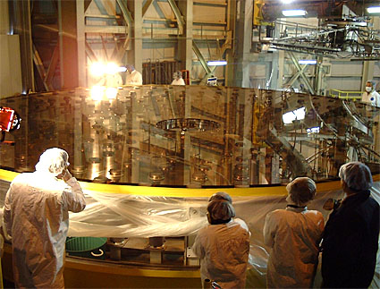 主鏡のたわみを補正する 261 本のアクチュエータは、主鏡セルに収まっています。主鏡セルの上では、アクチュエータの調整が入念に行われました。一本のアクチュエータは、長さ約 1.5 メートル、重さ約 70 キログラムです。