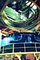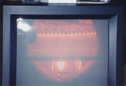 主鏡は、温度が変化しても変形しにくい超低熱膨張ガラス (ULE) からできています。アルミニウム膜がなくなった透明なガラスを通して、アクチュエータを支える穴が見えています。ガラス表面の検査の後、アルミニウムをメッキする (蒸着作業) のため、主鏡を大型真空蒸着装置に入れます。