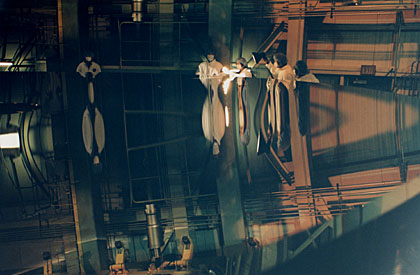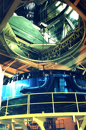 一日後の9 月 12 日、仕上がり具合の検査を行い、きれいな反射面ができたことを確認しました。アルミニウムの膜の厚さは、わずか 0.00017 mm です。検査の後、主鏡を再び主鏡セルに乗せ、クレーンを使って望遠鏡本体が待ち受けている観測階に吊り上げました。