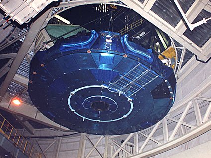 主鏡を乗せた主鏡セルを望遠鏡に取り付けました。これから共同利用観測が再開する 10 月中旬までの間、すばる望遠鏡では制御系システムの調整や試験観測を行っています。