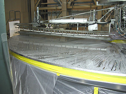 続いて主鏡の洗浄です。水と洗剤により、鏡の表面についたほこりや油分を落とします。すばる望遠鏡の大型鏡面洗浄装置は、コンピュータで制御された巨大な皿洗い機のようなものです。