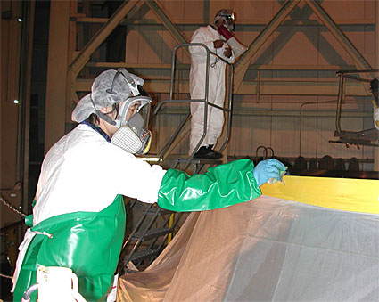 次に塩酸混合液を使って、鏡の表面の古いアルミニウムを溶かしました。塩酸は非常に危険な薬品であるため、スタッフはガスマスクや手袋を身につけて作業を行います。
