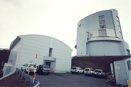すばる望遠鏡のドーム (右) と観測制御棟 (左)