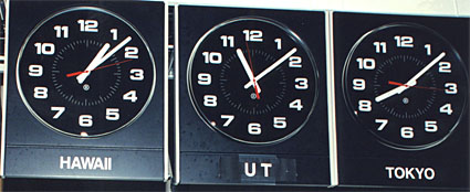 観測室には、3 つの時計があります。左はハワイ標準時、真ん中は世界時 (UT)、右は東京の時刻 (日本標準時) です。一般的に天文学では、世界時が基準の時刻系として使われています。また東京都三鷹市の西端に、国立天文台本部の三鷹キャンパスがあることから、日本標準時も表示しています。